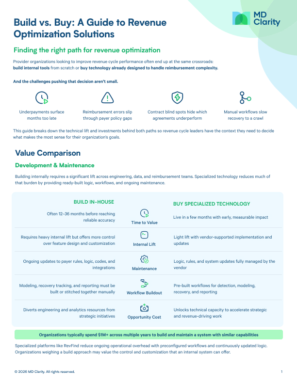 This guide compares the cost, time-to-value, technical demands, and risk tradeoffs of building vs. buying revenue optimization solutions so revenue cycle leaders can choose the right path to faster recovery, stronger payer insight, and scalable performance.